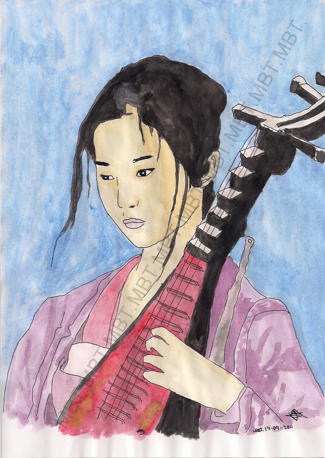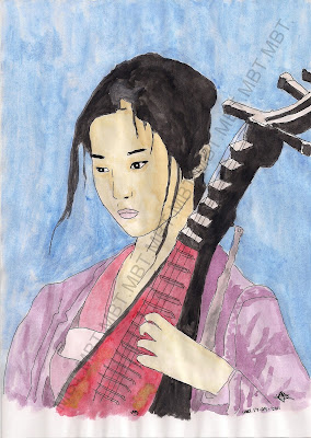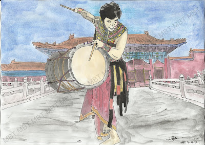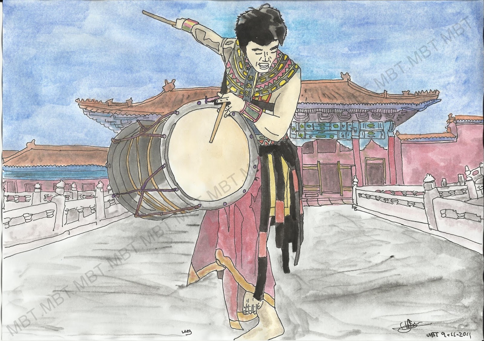 Este dibujo está inspirado en un personaje del Circo del Sol, con fondo de la Ciudad Prohibida.